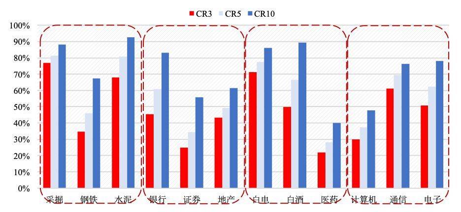通过测算我们发现,周期行业马太效应最强,其中钢铁CR10接近70%,采掘和水泥CR10均在90%附近。