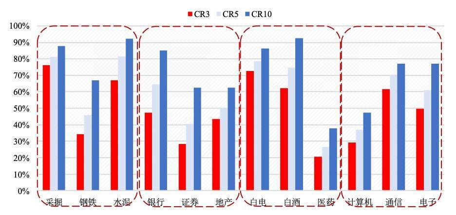 根据国泰君安策略团队的统计,一些行业如采掘、白电,行业前三名的营收占比超过70%,白酒、水泥、通信的行业前三营收占比也超过60%。