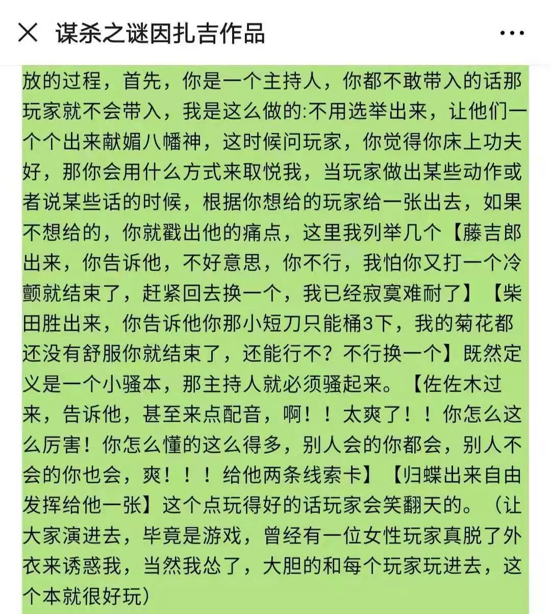 所以,不少玩家会希望借机在这种角色扮演的过程中‘爽一把’,图个乐呵。”KID有些无奈。 以《清州会议》为例,尽管其剧本设置的尺度让不少体验过的玩家痛斥制作方,然而在某些剧本店内,依然把本子作为噱头,甚至有的店家会提议进行更多“大尺度互动”以调动气氛,让玩家更活跃的参与到色情内容的探讨中。贵阳某推理社便曾经给出作者建议,要求主持人“放开尺度,引导玩家”。