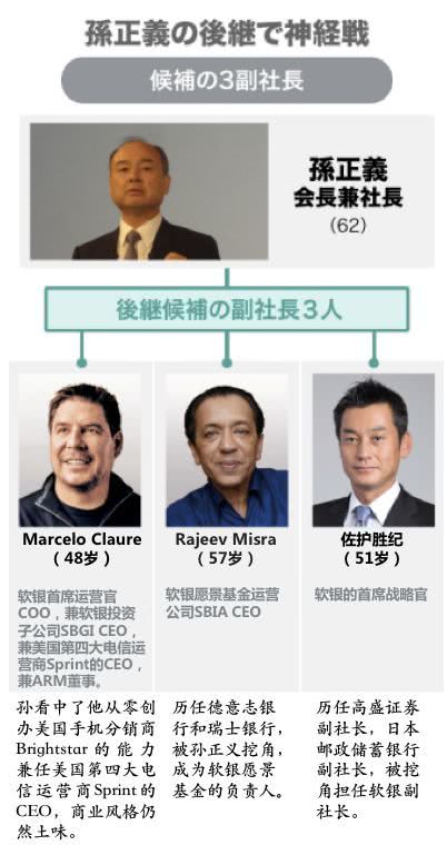 2018年6月软银的股东大会上,Marcel Claure(软银的首席运营官COO和软银投资子公司SBGI的CEO),Rajeev Misra(软银愿景基金运营公司SBIA的CEO)以及佐护胜纪(软银的首席战略官)被同时任命为副总裁,成为了孙正义潜在的接班人,形成了软银集团内部的"三足鼎立"的局面。