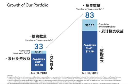 更为重要的是,财报数据显示2018年软银集团大幅降低了在Softbank(日本国内通信业务)、Sprint的出资比率。再对比2019年Q3财务报告,愿景基金翻倍的收购成本和投资数量(参考下图-2)。近年来主营业务的"动作频频"的背后是软银战略的转变。