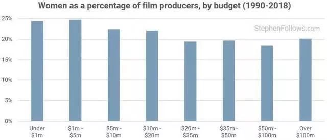 认为女性可能干不好制片工作,不仅仅是来自于人们的偏见。实际上,Stephen Follows的调查显示,即便在全球,在所有制片岗位中,职位越高,女性比例越低;而女性制片人的职业生涯也经常容易被限定在了小成本制作中:预算在500万美元以下的电影中,女性制片占23%,但预算在5000万美元以上的电影中,女性制片只占16%。随着项目资金、规模扩大,女性担任现场制片的比例也大幅下降。