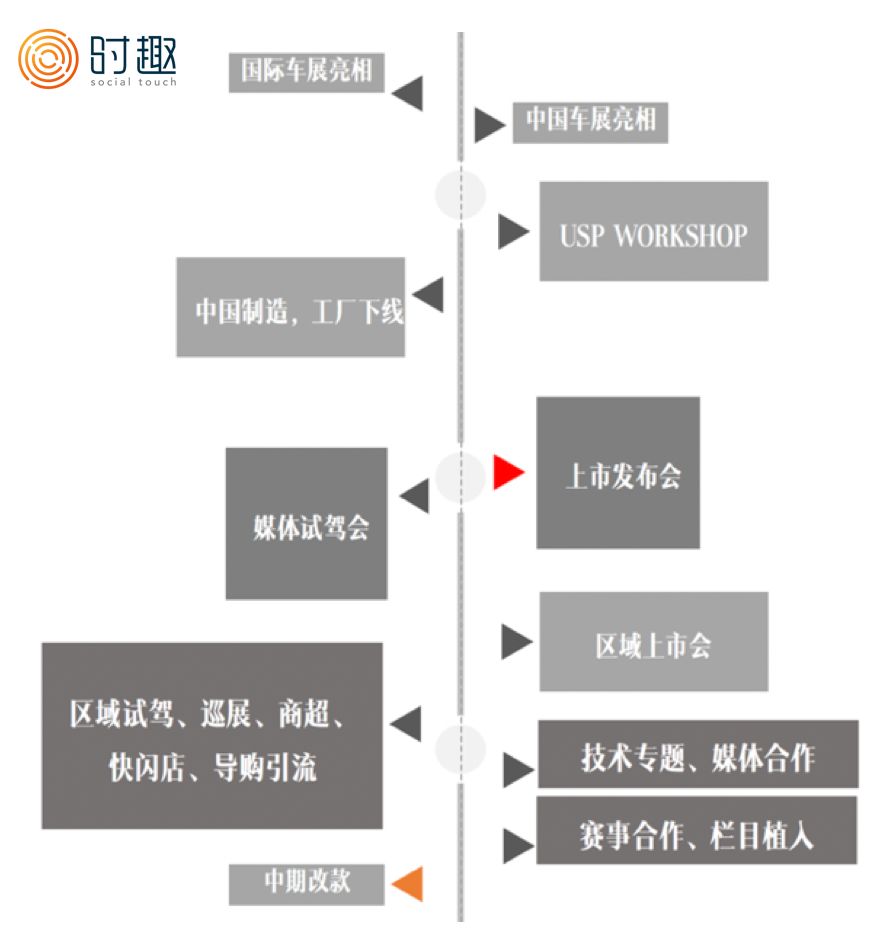 因此时趣在服务某汽车品牌时,希望通过一场基于新品发布会的事件营销,同时疏通品牌、销售、经销商渠道、消费者多方难题,借助事件的营销力达成一个品牌整体的解决方案。基于这个策略思考,时趣认为这场发布会事件营销需要达到以下几个目的: