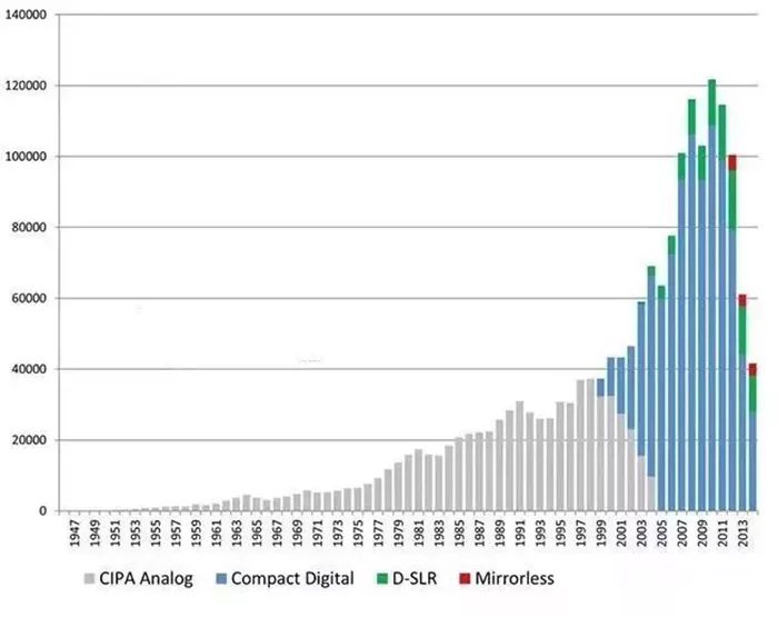 这是2013年之前相机产量图,图中的灰色代表胶片相机,蓝色绿色都是数码相机。可以看到,从1999~2000年,数码相机开始进入市场,之后就“碾压”般的把胶片机“赶”出了市场。