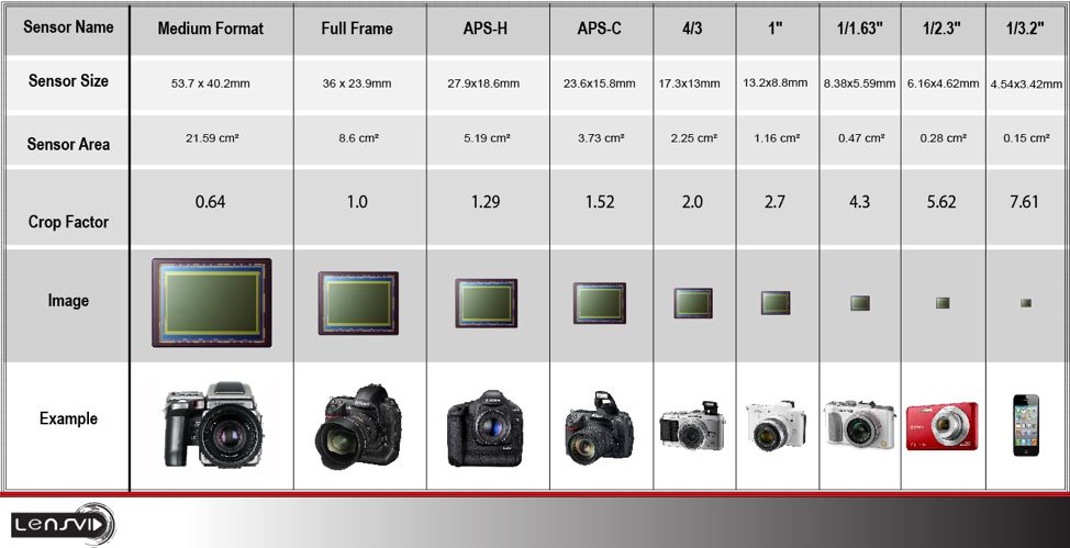 首先看下面这张对比图,它显示的是各种数码相机中感光的传感器原件(通常是CMOS半导体晶片)相对的尺寸大小。