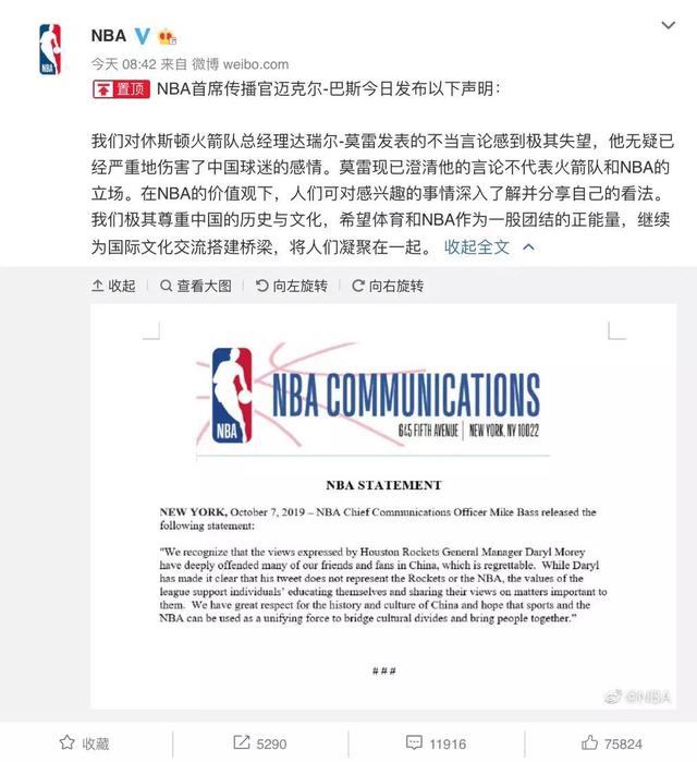 而且不只是火箭,「NBA中国」在整个事件中也处于一个关键的角色。他们后续的官方声明和处理措施,对于以后国民和媒体的事件定调有着举足轻重的作用。但很显然,目前NBA官方在中国的应对发声,几乎成为了又一条典型的危机公关反面案例。