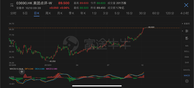 北京时间10月10日,没有意外,股价接连上涨的美团点评,今天再一次创造了自己的历史最高价,并一举突破了90港元大关,朝着100港元进发。