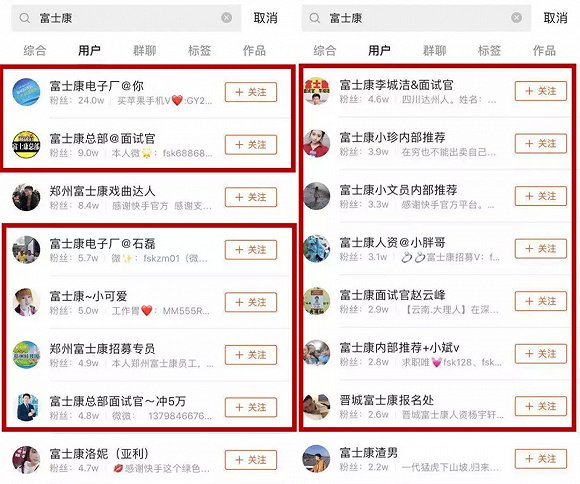 富士康粉丝靠前的用户中招聘者众多