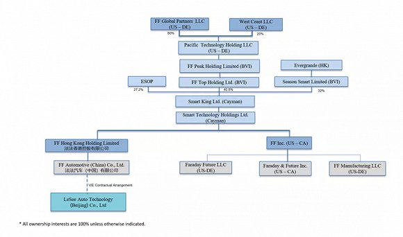 根据文件,贾跃亭持有FF 40.8%的股权,该股权以公司的形式持有,即上图中所示的 FF Top Holding Ltd.。另外27.2%的股权则是员工激励股权,即上图所示的ESOP。而剩下的32%的股权则在Season Smart Limited手中,即恒大关联的公司。