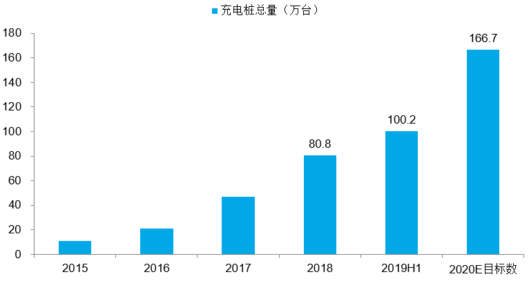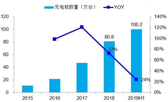 而充电桩的数量在其拉动下,从2015年的10.7万台连续增长至2019年6月底的100.2万台。