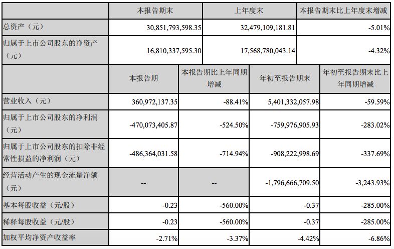 10月28日,众泰汽车股份有限公司(众泰汽车,000980)披露第三季度报,前三季度实现营收54.01亿元,同比下降59.59%;净利润亏损7.60亿元,同比下滑283.02%。其中三季度亏损4.7亿元,同比下降524.50%。