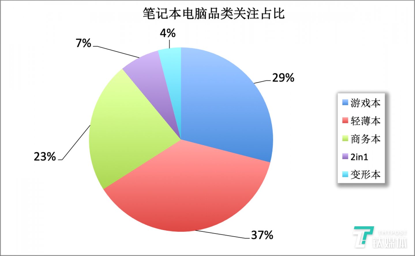 纵观2019年的笔记本电脑市场,消费者对其的品类关注更加明朗。其中,消费者对轻薄本(37%)与游戏本(23%)的关注占比超过60%。