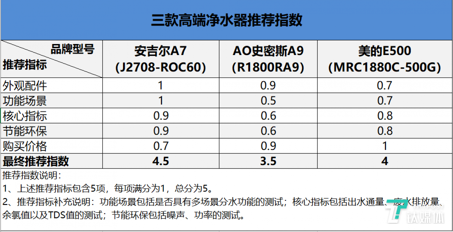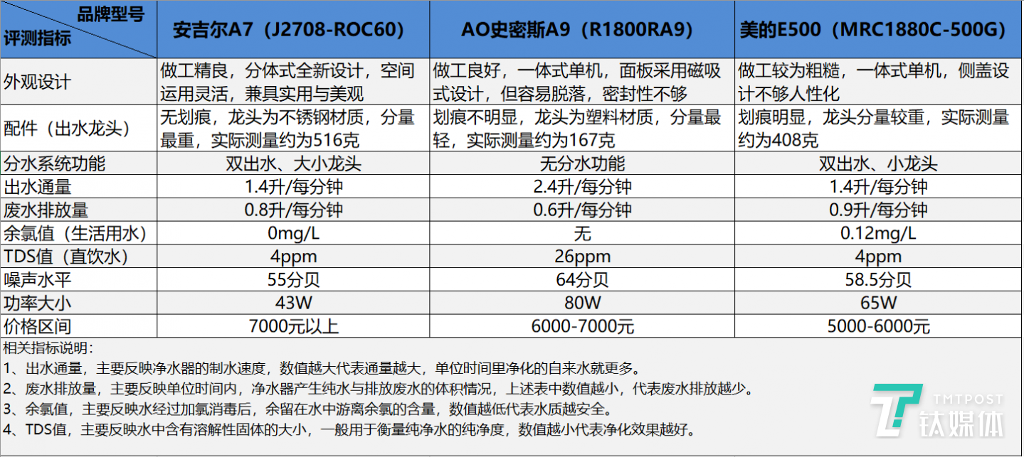 为了让大家能够更加直观地看到上面对比测试的所有数据,钛媒体也做了一个详细的数据表格,并针对这些产品的表现进行打分。从表格中不难看出,安吉尔A7(J2708-ROC60)净水器在噪声、功耗、水效上都有着三款产品中表现最好的的,分体式设计在功能性表现也十分出色,但是其售价也是此次横评中最高的。