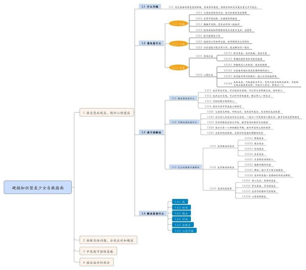 一周后出院,靠仅剩的一点精力,她把构建好的思维导图汇总,写成一份完整的可操作性的“报告”,取名为“硬核知识型美少女自救指南”。里面包括4个大方面:1.接受患病现实,做好心理建设。2.拆解具体问题,分别应对和规划。3.中长期可持续策略。4.独自面对的部分。每个方面又做了详细到可操作阶段的拆分。