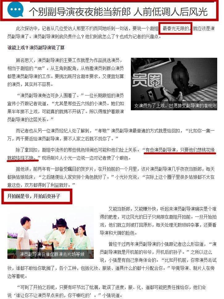2014年,腾讯娱乐的《贵圈》栏目推文《那些剧组里你不知道的事:个别副导演夜夜换新姑娘陪睡》,其中提及这一群体时说道:“剧组最春光无限的角色”“只要他们想桃花缘就能络绎不绝”“孝敬演员副导演最普遍的方式就是回扣,不然之后人家就不找你了”。