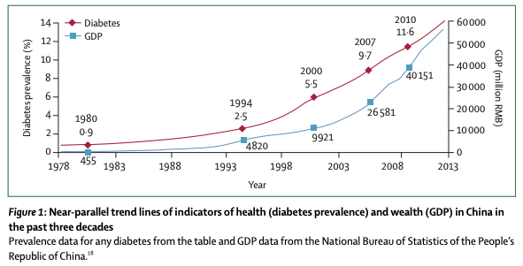 1980年,中国糖尿病患病率为0.67%,到了2010年升高到11.6%,从下图可以看出糖尿病从传统认知中的“富贵病”走向“大众病”的过程。