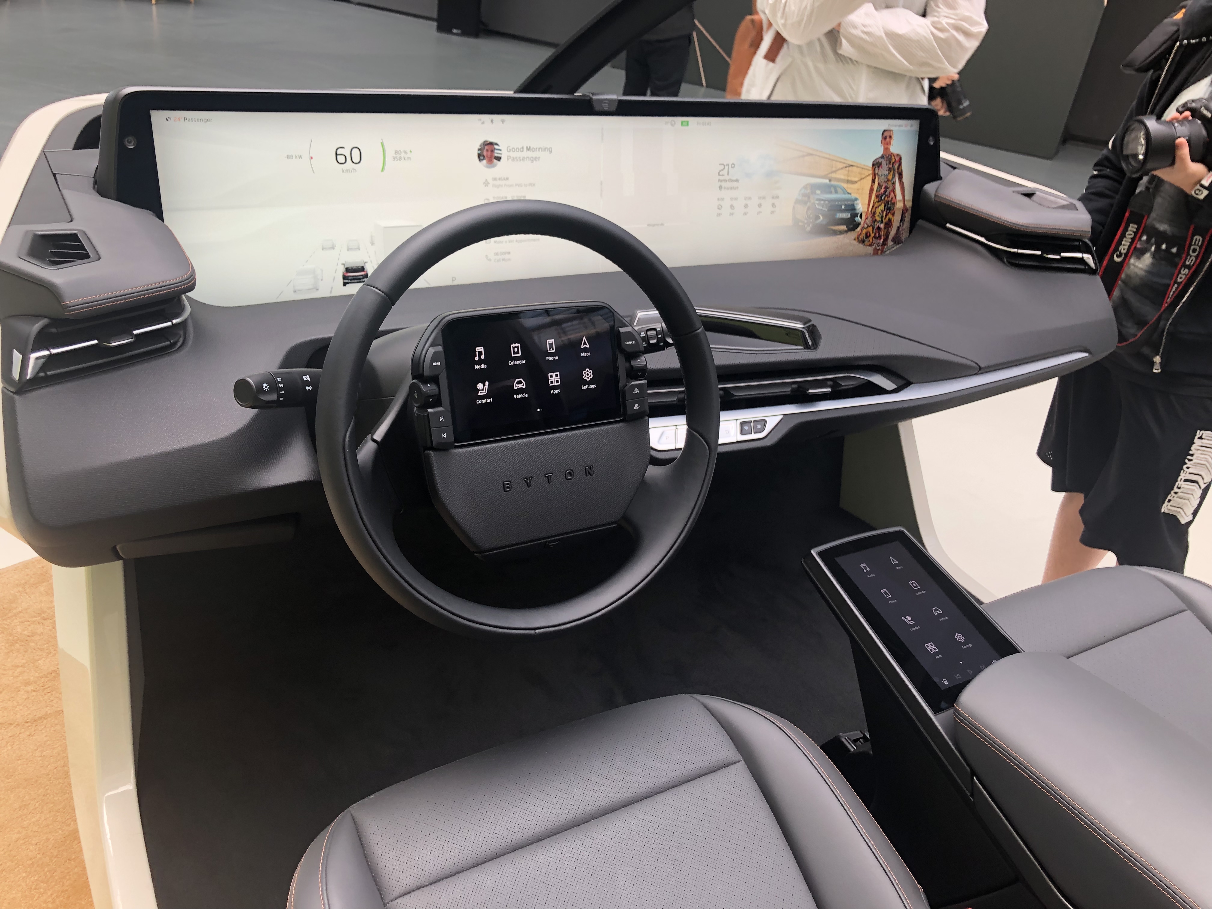 标志性的48英寸共享全面屏是拜腾特色。这块大屏分为三个区域,电量、车速等驾驶信息集中在左侧,驾驶员通过方向盘上的触摸屏对大屏进行控制;中部和右侧区域提供导航和娱乐服务等,这两个区域的显示画面可以互换,并可供副驾驶乘客单独操控。