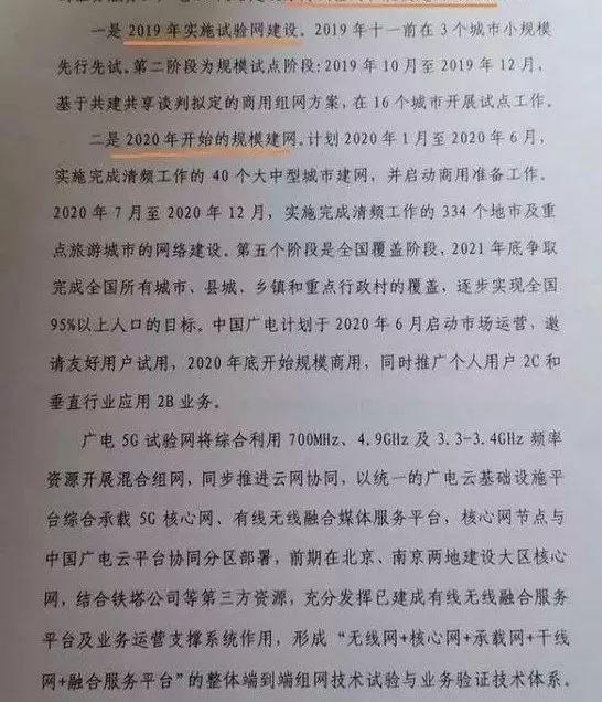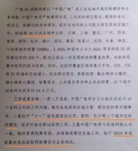 一个多月前有一份《中国广电5G试验网建设实施方案》在网上传播,内容显示,今年10-12月中国广电将基于共建共享谈判拟定的商用组网方案,布网网点涉及北京、广州、上海等16个城市,对应试验网投资为24.9亿元。