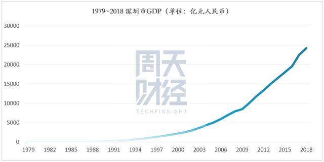 从 GDP 上看,1979 年~2018 年,深圳总 GDP 从 1.96 亿元增长 24221.98 亿元,年均增速高达 27.88%,显著高于同期的全国平均水平。2017 年,深圳成为继北京、上海之后中国第三个生产总值突破 2 万亿人民币大关的城市。