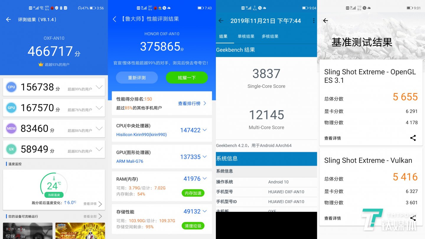 关于这颗SoC的性能测试,钛媒体依旧采用了跑分+实测的方式,跑分测试软件为四款:安兔兔、鲁大师、GeekBench和3Dmark。作为目前安卓阵营中最新的量产SoC产品,麒麟990的硬件性能十分强大,安兔兔跑分达到466717、鲁大师跑分为375865,GeekBench单核3837、多核12145,3Dmark两个场景分别为5655和5416。