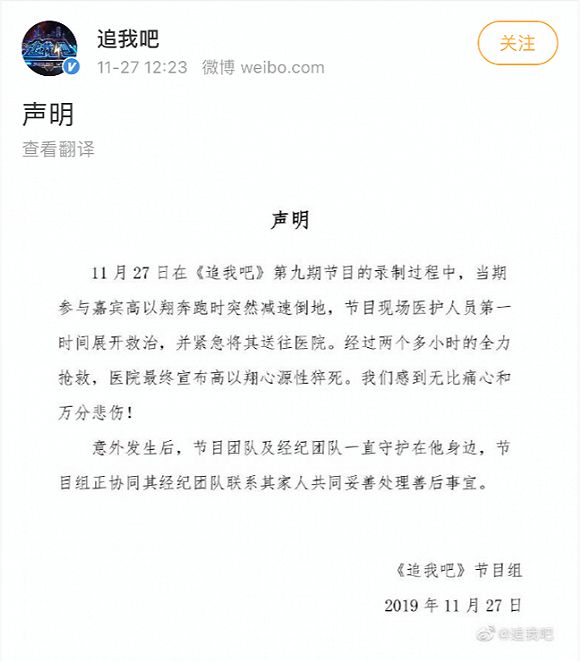 中午12点23分,《追我吧》发布声明,再次确认了高以翔去世的消息,并告知死因为“心源性猝死”。