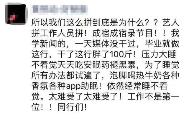 毒眸观察到朋友圈里的综艺行业从业者们几乎都对综艺熬夜录制现象发出了诘问,一位同行这么写道:“为什么总是天黑才开始录节目,一录一通宵,为什么是人命的代价让问题浮出水面?”