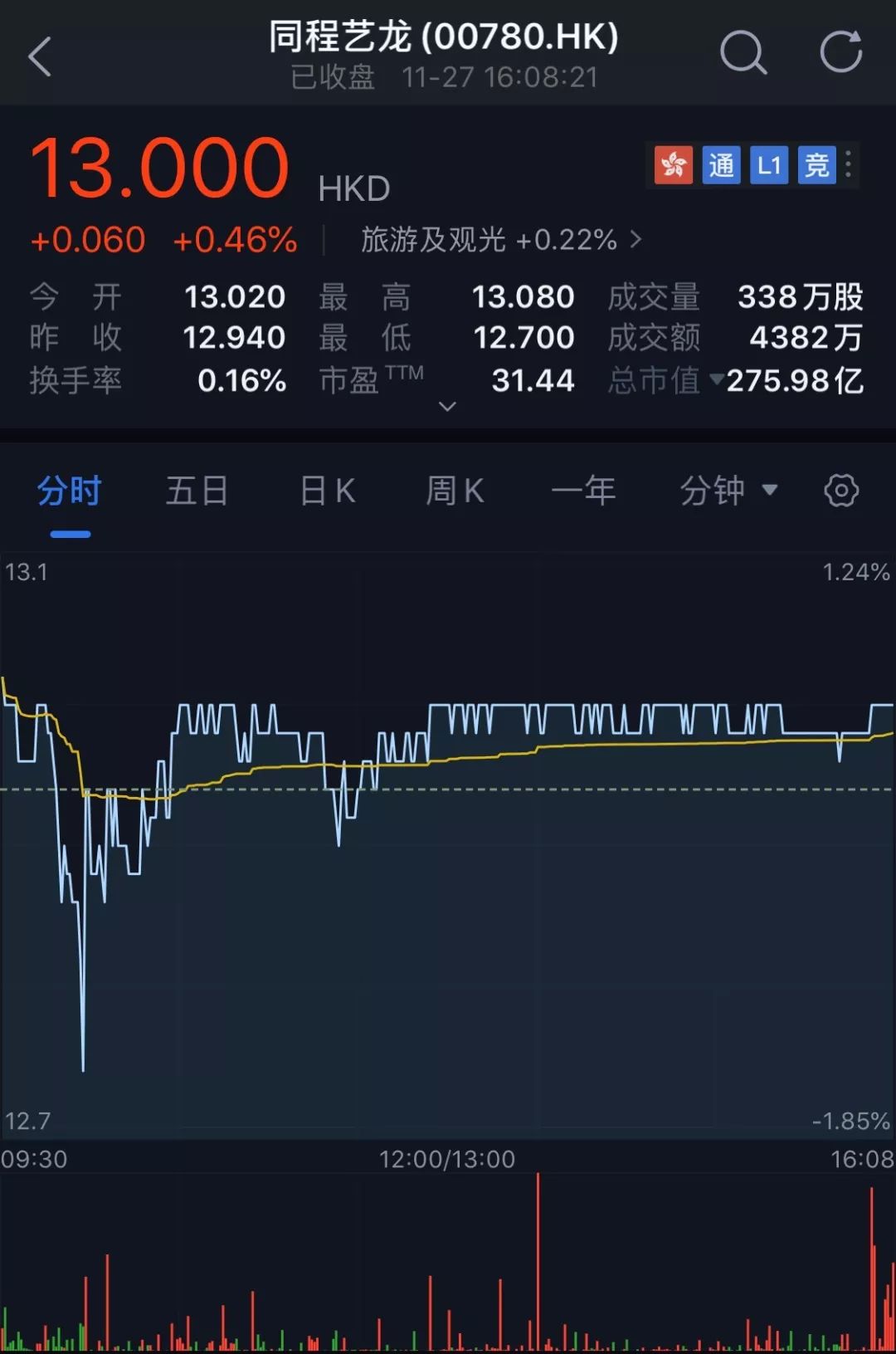截至今天(11月27日)港股收盘,同程艺龙报收13港元,市值275.98亿港元。