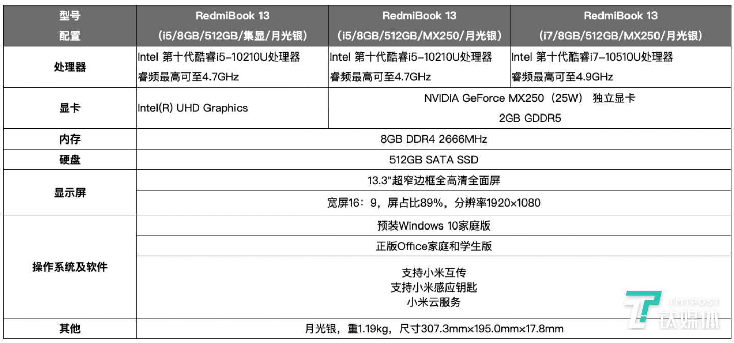 RedmiBook 13参数一览