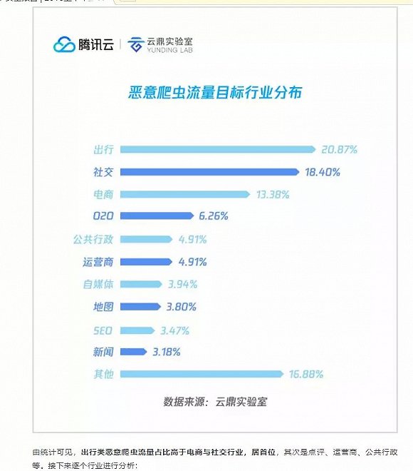 值得注意的是,据云鼎实验室2018年发布的《互联网恶意爬虫分析》报告显示,目前,恶意爬虫分布的领域以出行类流量占比最高,为20.7%;其次是社交占比18.40%;再次是电商占比13.38%;仅接着是运营商、公共行政等。