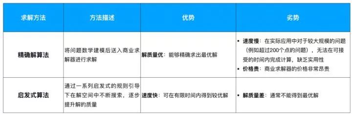 而VRP问题的复杂度远超2^n,普通的求解方法基本无法得出可行解。学术界和工业界对此类问题的优化求解方法可以分为精确解算法和启发式算法两大类,如下图。