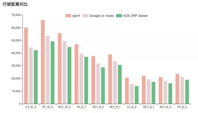图7. πOS VRP Solver与 Google or-tools和jsprit对比行驶距离(横坐标代表数据集,纵坐标代表行驶距离,越小越好)