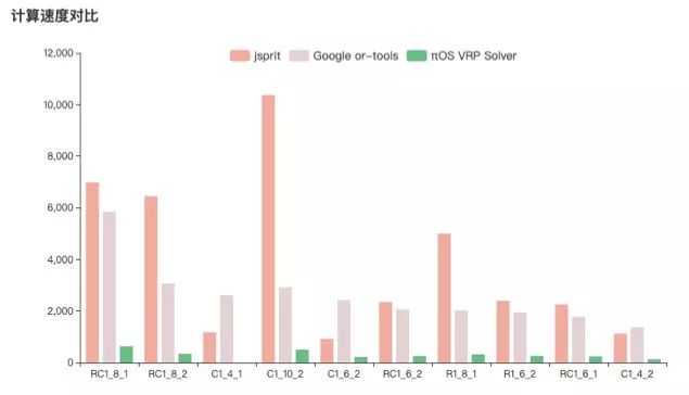 2) 从计算时间维度来看,从下图明显可以看出,πOS VRP Solver在求解速度方面优势非常明显。