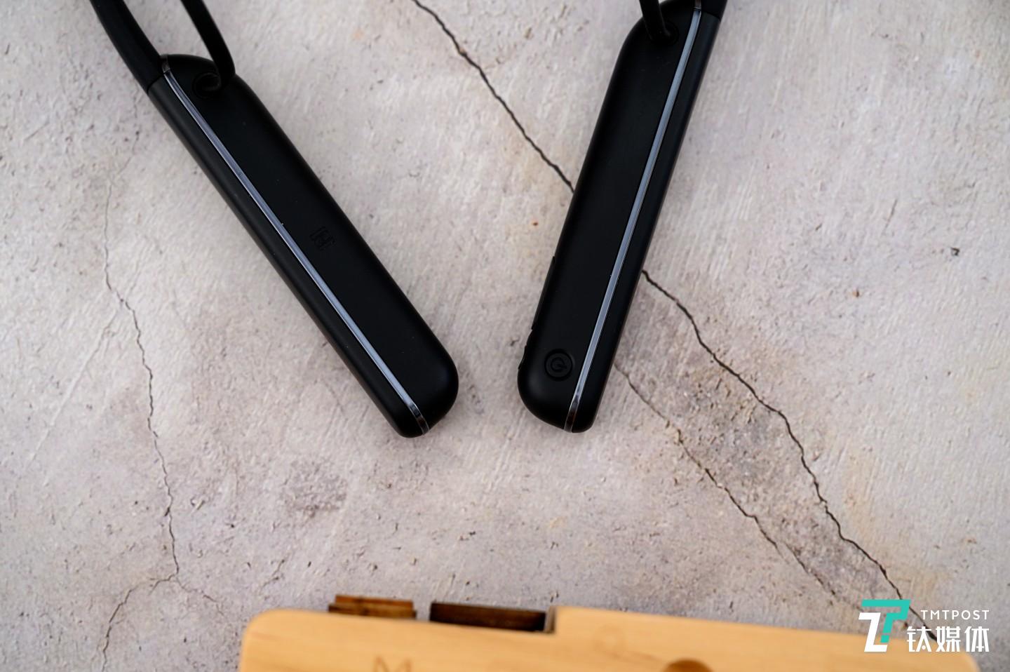 在机身的细节设计上有几点是比较值得注意的,首先是由一体化硬质改变为前半部分硬质,颈挂弯折部分软质的设计,这也是能够折叠收纳的前提,同时也提升了耳机的佩戴舒适度,挂在脖子上的时候可以更好地与颈部贴合。第二个则是独立麦克风/操控模块的加入,在颈部主机上仅保留了一颗电源按键。
