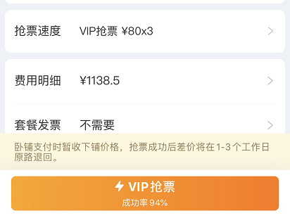 过年回家是一年中最重要的事情,所以,孙先生希望尽一切可能来提升自己成功买票的几率。为此,他还提前几天花80多元购买了这个OTA平台的VIP,把抢票速度拉倒了最高的VIP级别。此时,原本总价不足900元的3张车票,在加速包的“推进”下已经变成了1138元,加上80多元的会员费,已经累计多花了300多元。