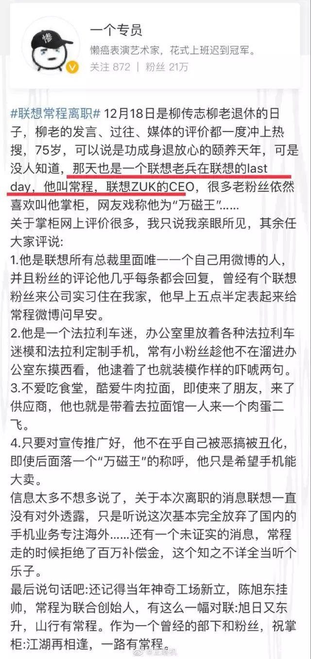 2019年12月31日,作为联想集团副总裁、中国区移动业务负责人的常程发布微博,正式宣布从联想集团离职。