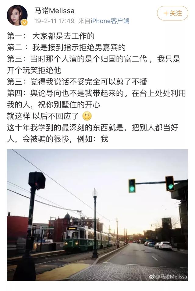 忍无可忍之下,今年2月,马诺在微博发布声明:大家都是去工作的,只是接到指示拒绝男嘉宾。最重要的是,“舆论导向也不是我带起来的,在台上处处利用我的人,祝你别墅住得开心”。