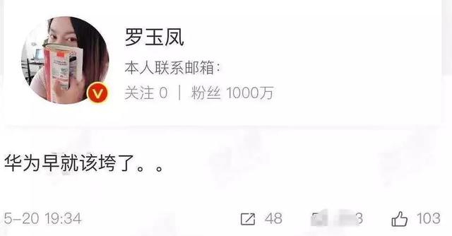 2019年5月20日,凤姐在新浪微博评论称“华为早就该垮了”,随后在舆论压力下删博:“这几天没看新闻,外面发生什么事我根本就不知道”。不久,坐拥1000万粉丝的罗玉凤微博注销,就此消失在公众视野。