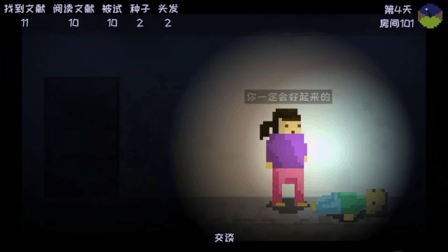 不经意间的提醒,你想到了去找“另一个你”谈谈心。慢慢地推开101的房门,你看见“你”又苍老了许多。在“另一个你”的帮助下,你了解到可以去森林里感受自然,舒缓情绪,还能捡希望的花种。