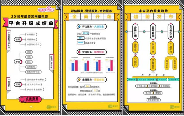 2019年,爱奇艺、腾讯视频、优酷均对网络电影扶持模式进行了升级:腾讯视频将“网络大电影”升级为“自制电影”;优酷上线了“剧场模式”,升级内容开放平台;爱奇艺为片方提供全生命周期扶持,帮助匹配资金主创、演员团队和前置营销服务、金融服务,同时升级营销合作方式为“营销分成+联合营销”,将平台营销能力赋予合作方。