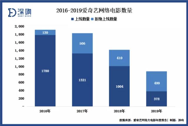 据爱奇艺发布数据显示,2018年爱奇艺收到合作方提交影片共1710部,上线1004部,拒绝上线率为24%。但在2019年,截至11月爱奇艺收到合作方提交影片共877部,上线378部,拒绝上线率为56.90%。