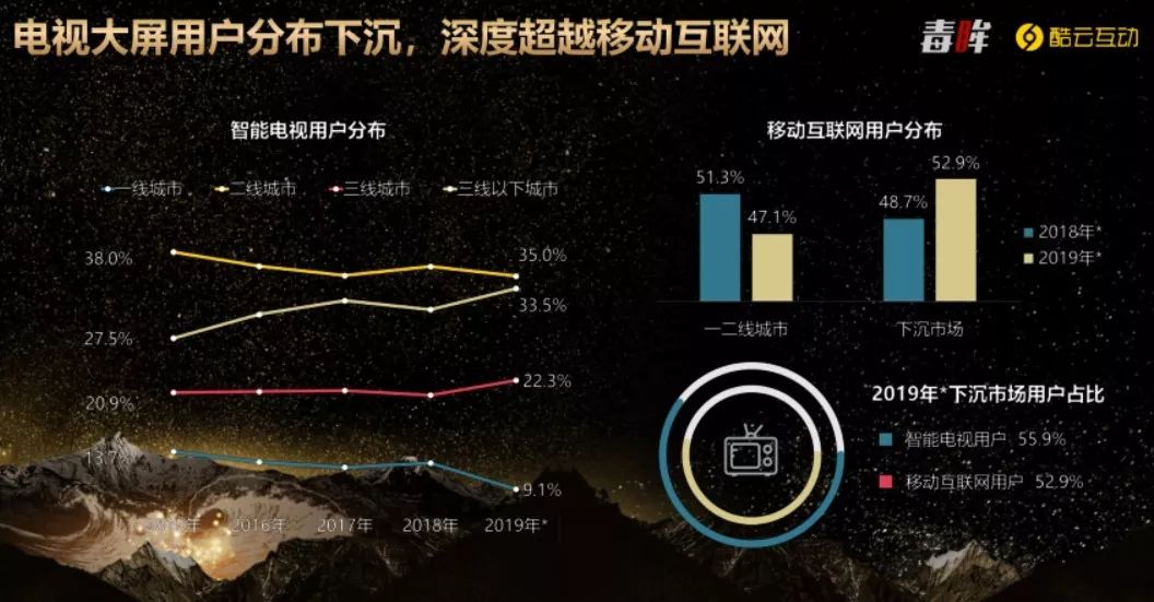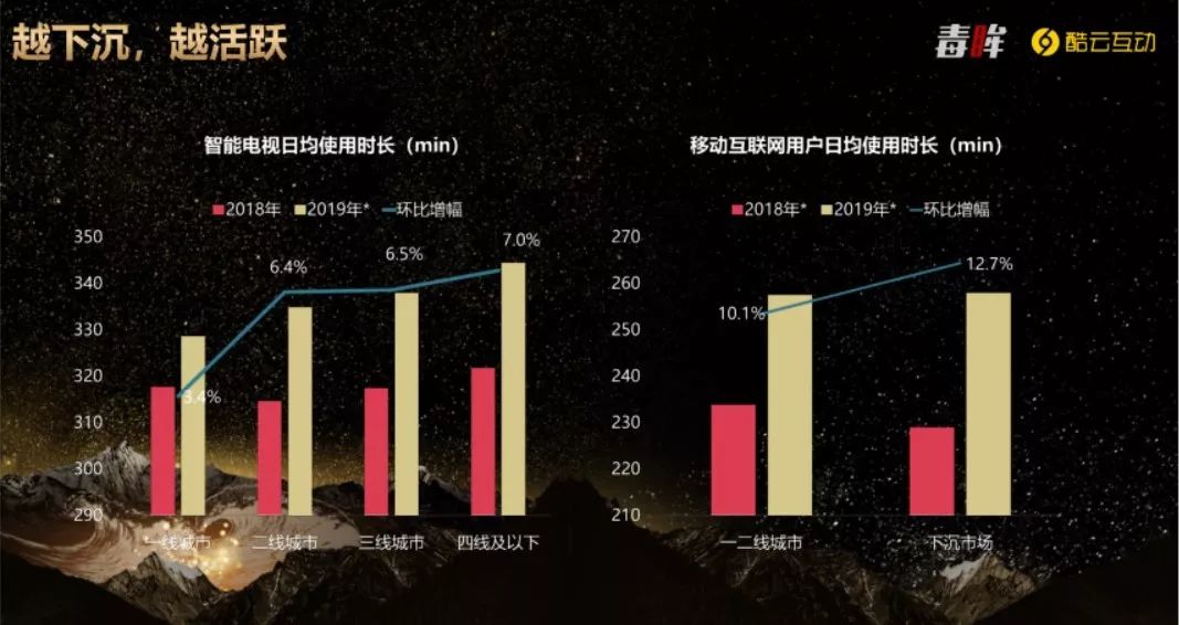 从云合数据来看,分账剧的突破意味着庞大下沉市场的需求:与传统电视剧相比,分账剧受众平均年龄更小,拥有更多女性用户,高中以下学历占比更高。下沉市场的潜力不仅体现在分账剧,还在“客厅”上。在2019年毒眸与Sir电影联合举办的文娱大会剧集论坛上,酷云互动CEO分享了2019年电视大屏用户正在下沉的趋势:仅就三线及以下城市来说,电视大屏用户呈连年递增趋势。且从2019年移动互联网用户日均使用时长来看,下沉市场用户活跃度也远高于一二线城市。