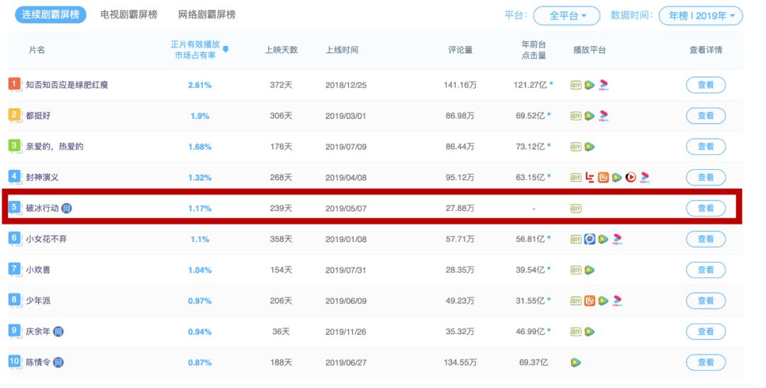 《破冰行动》是TOP5中唯一一部平台独播剧