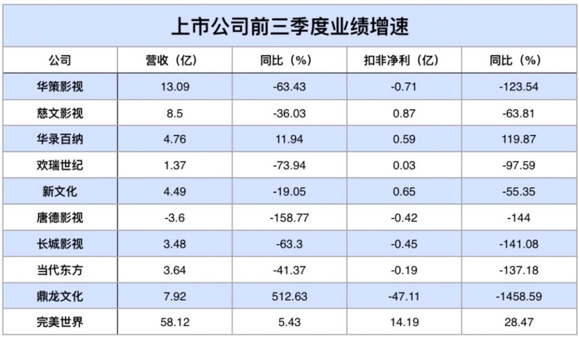 据毒眸统计,最新的Q3财报显示,华策影视、慈文传媒、欢瑞世纪、新文化、唐德影视等10家有电视剧业务的公司,前三季度的业绩并不理想。其中7家营收同比增幅下降,8家公司的扣非净利同比下滑,多家公司在2019年播出的电视剧项目数量减少。欢瑞世纪除了一部《听雪楼》已经播出之外,目前占据存货前五的影视剧仍然以古装剧为主,播出存在未知;鼎龙文化也受到限古令等因素影响,2019年只有一部网剧《璇玑图》开机;曾参投《克拉恋人》《大军师司马懿之军师联盟》《长安十二时辰》等多部影视作品的印纪传媒甚至在2019年被终止上市等等。