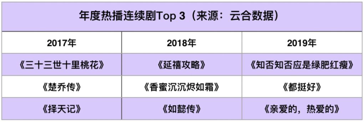 到了2019年,年度榜单前三里除了《知否知否应是绿肥红瘦》打响年初第一炮后,紧随其后却是现实主义题材的《都挺好》,和电竞爱情题材的《亲爱的,热爱的》成为年度爆款,打破了古装剧此前一直霸占前三的市场格局。