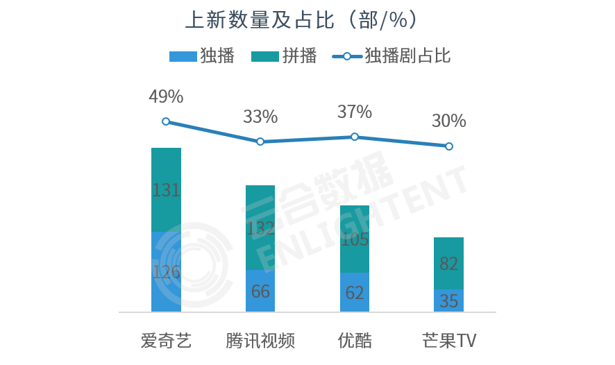包括在2020年的电视剧待播名单里,据不完全统计,爱奇艺目前公布的77个剧集待播项目中,自制剧达50部以上,占比超过65%;腾讯视频有37部剧目,而旗下企鹅影视参与出品的作品达到21部,占到总比的57%;优酷目前公布的27个待播剧集里,至少17部剧集里有优酷出品的身影,占总数量的63%。