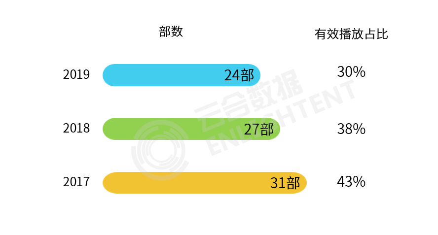 2019年年底《庆余年》的热播,最高市占率一度超过50%(数据来源:云合数据),但2019年古装剧仍是以惨淡收场——据云合数据显示,2019年上新剧集有效播放TOP 100中,古装剧份额占24部,有效播放占比30%,两个数据皆是近三年最低,更别提6月的几次撤档事件,及越来越严的古装管控。