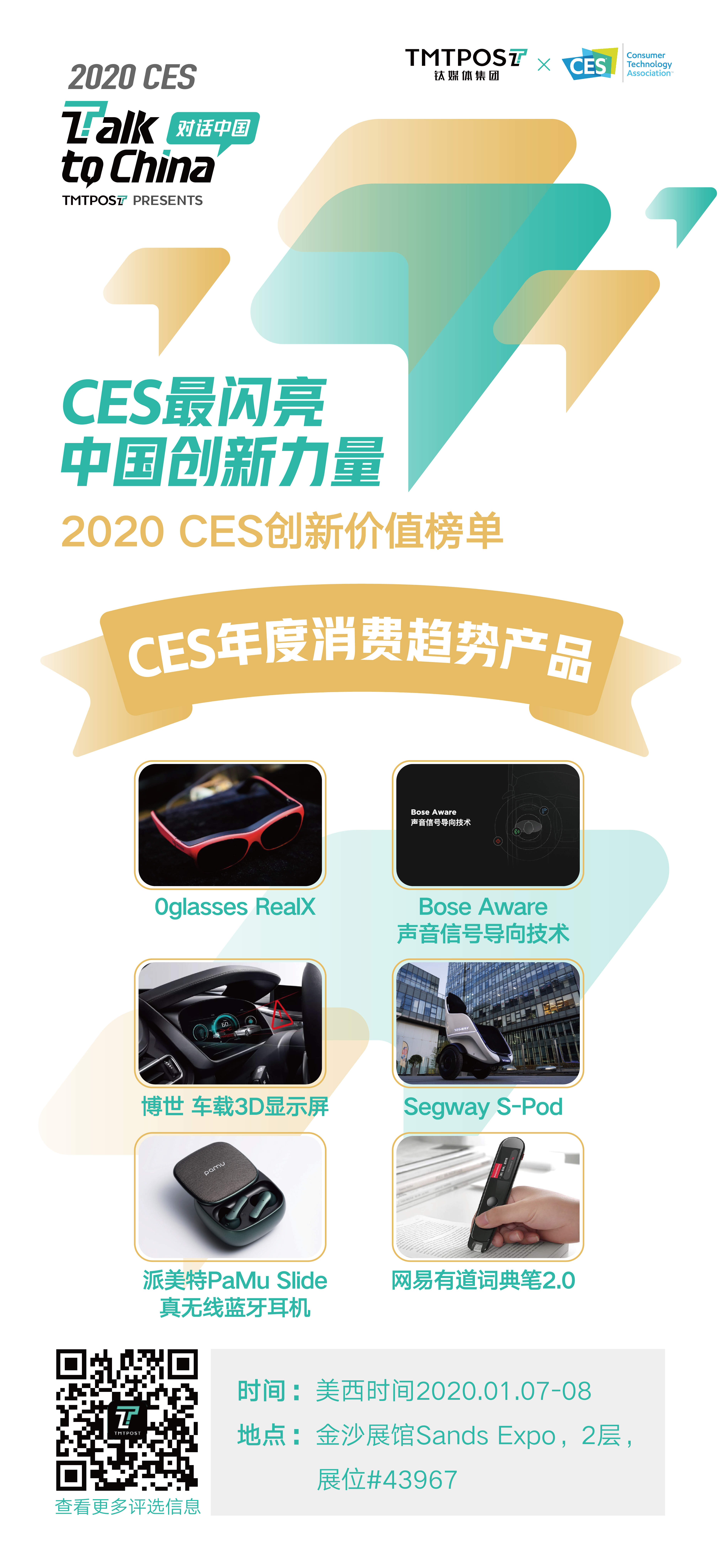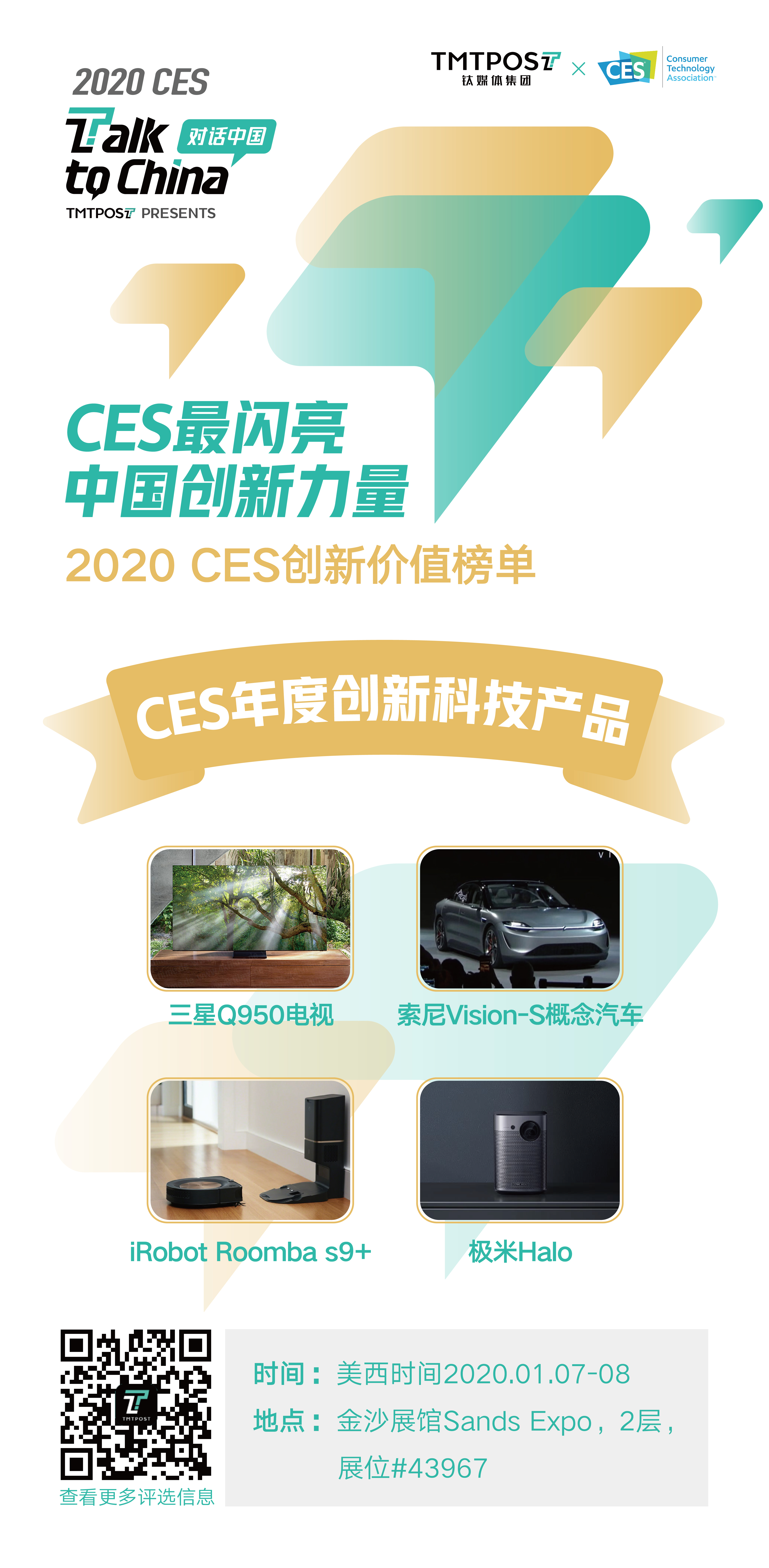 从中国看世界,站在世界看中国。钛媒体通过独立专业内容团队调研,结合各行业意见领袖观点,对1500余家 CES 中国参展企业的数千参展产品进行了筛选、评测和评比,根据CES期间产品的消费引领能力、技术领先能力、市场敏锐力、用户欢迎度和媒体影响力等综合指标进行评选,重磅发布四大“2020 CES创新价值榜单”:“CES消费趋势产品”、“CES创新科技产品”、“CES影响力之星”。