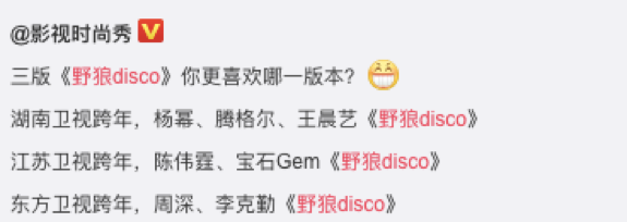 而随着露出频次的高涨,甚至不少人在微博表示,“为什么哪个台的跨年晚会或多或少的都唱了野狼disco?”怀疑今年过的不是鼠年,而是“狼”年。