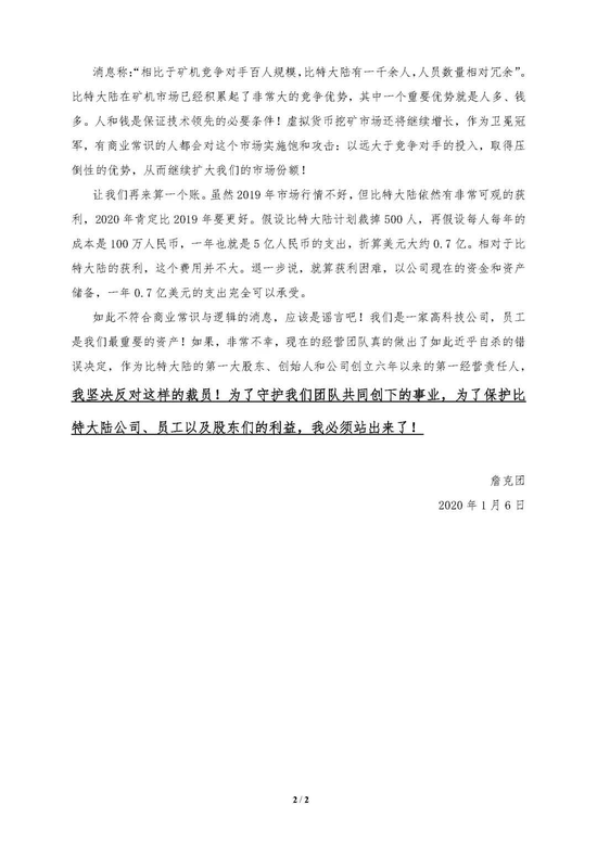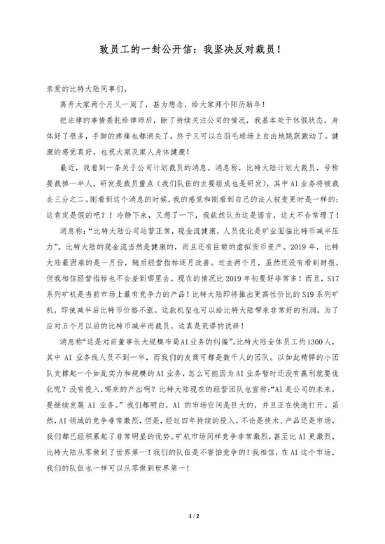 我坚决反对这样的裁员!为了守护我们团队共同创下的事业,为了保护比特大陆公司、员工以及股东们的利益,我必须站出来了!