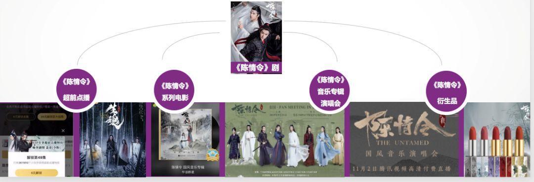 首先是根据网友“上头”的忘羡CP开发多重表情包、剧集相关衍生话题,随着《陈情令》剧组出圈,平台与出品方合力开发《陈情令》诸多衍生品,从同名OST音乐大碟,到VIP广播剧,再到《陈情令》线下一系列衍生品,同名真人版演唱会(泰国、南京两场),以及《陈情令》网大等等,有关《陈情令》的IP全方位运营模式,正在成为市场发力的新增长点。